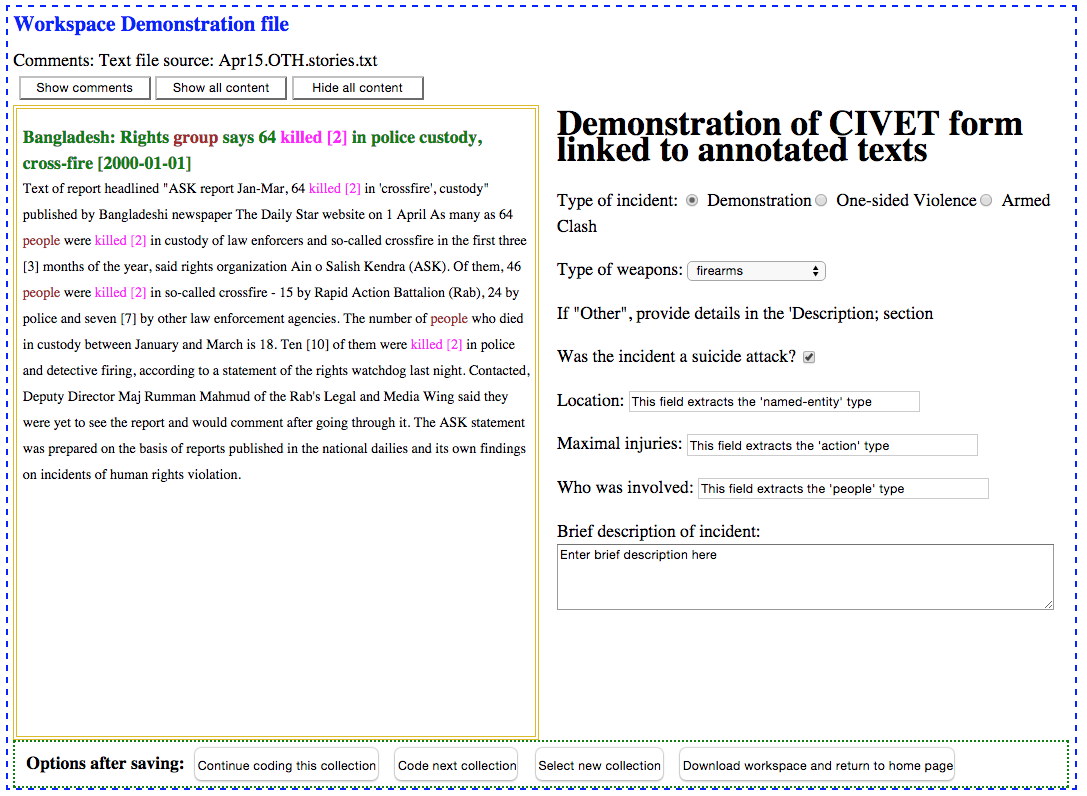 Clicking a text entry boxes associated with an annotation category will highlight the relevant words in text: In the demonstration version these are