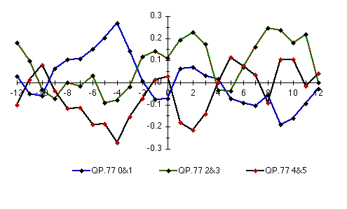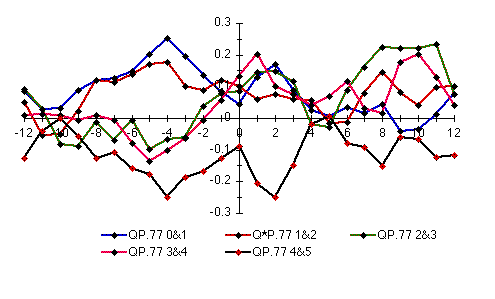 slight dip in the r=0 ridge around lag -4. Remarks: Cross-correlations of the P77 model